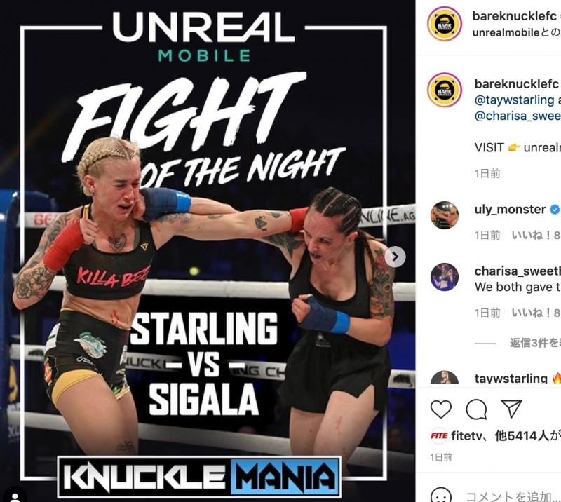 「ベアナックルマニア」のファイト・オブ・ザ・ナイトは、美女戦士のどつき合い(BKFCの公式SNSより)