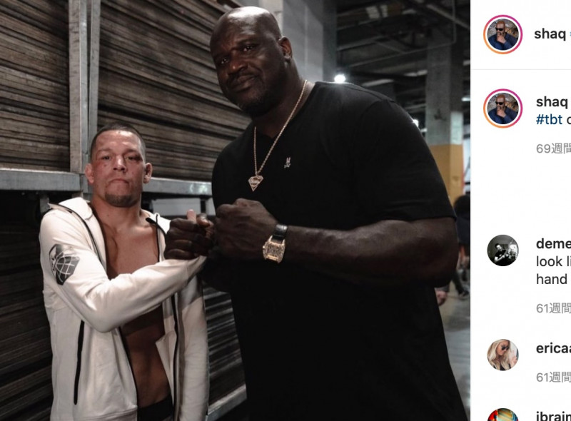 格闘技好きで有名な元NBAビッグスターのシャキール・オニール(右)。親交のあるUFC戦士ディアスとツーショット(オニールの公式SNSより)