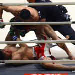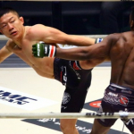 前回のバンタム級トーナメント準決勝でマネル・ケイプにハイキックを放つ堀口恭司=17年大みそか