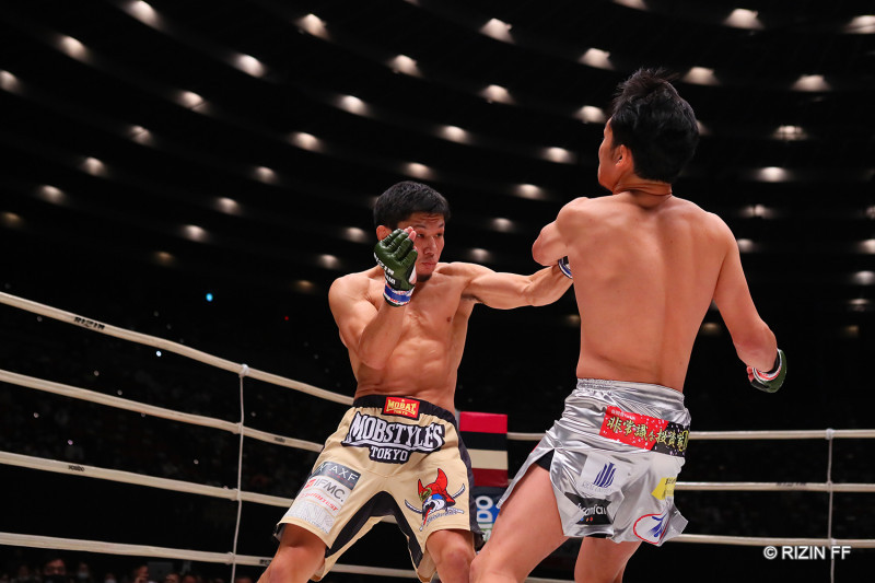 斎藤の左フックが朝倉にヒットする