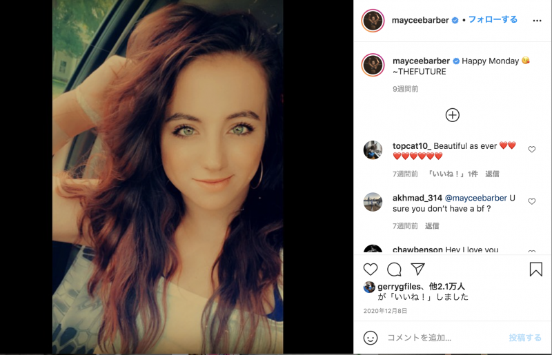 美女バーバーの色っぽく微笑む写真にSNSではハートマークが並ぶ(@mayceebarberより)