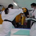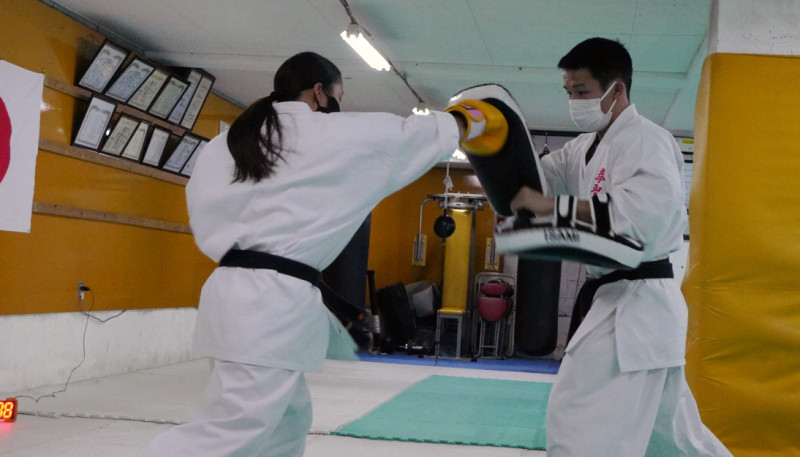 公開練習、しっかりと拳に力が乗った右ストレートを放つ田渕(左)