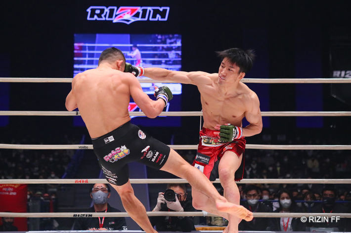 堀口のカーフキックに効かされるも、カウンターパンチをヒットさせる朝倉海