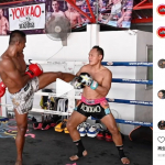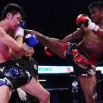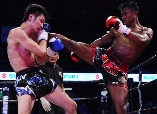 右ハイキックを放つブアカーオ(右)(写真は13年10月、MAX MUAYTHAIで佐藤嘉洋と対戦した様子)
