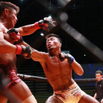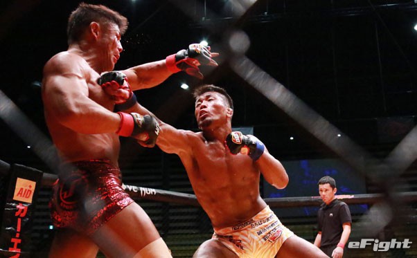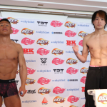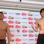 18年10月のDEEPライト級王座5度目の防衛戦で武田光司(右)に敗れて以来出場の北岡(左)