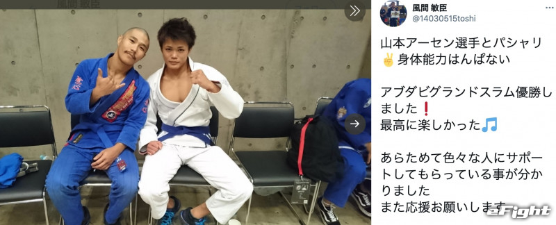 山本アーセン(左)とのツーショット写真。17年のアブダビグランドスラム東京で風間は山本アーセンに三角腕十字で一本勝ちし、優勝した(風間の公式SNSより)