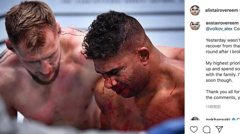 試合直後、流血のアリスター右)。その肩を組むヴォルコフ(左)(アリスター自身のSNSより)