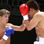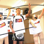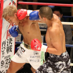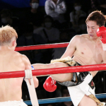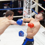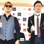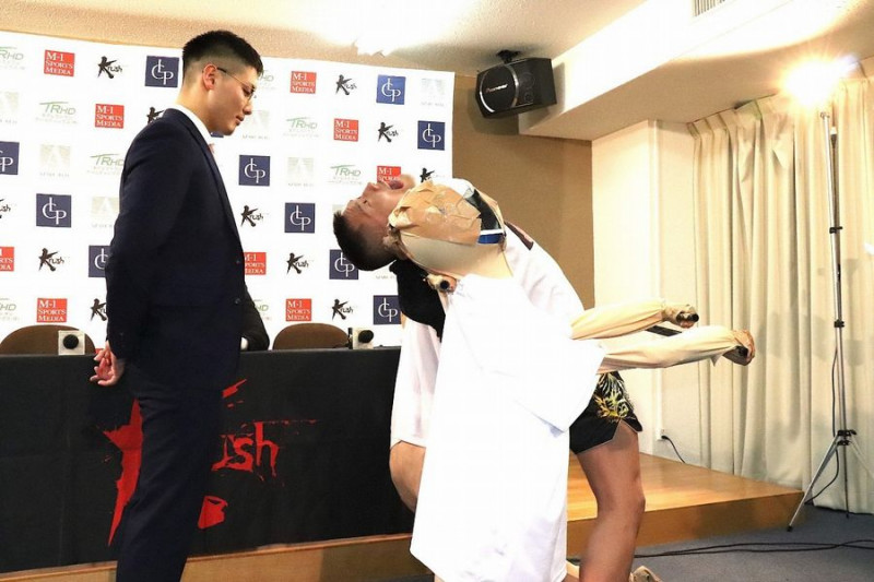 恒例のメンチ切り「フラッシュバック」を披露する堀井(右)と、それを見下ろす里見(C)K-1