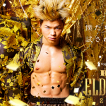 逆立てた髪型。ゴールドが基調の背景はまさにスーパーサイヤ人
