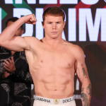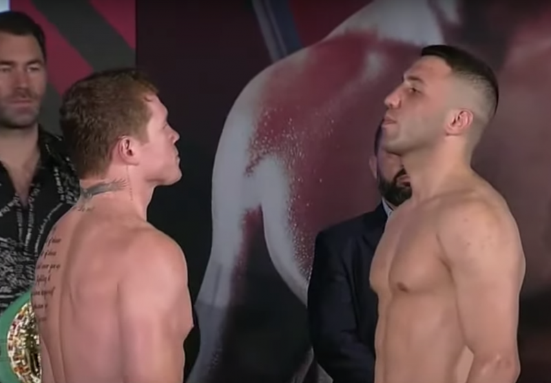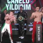 約15秒のフェイスオフ、カネロ(左)とユルドゥルム(C)DAZN