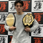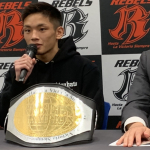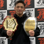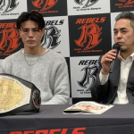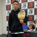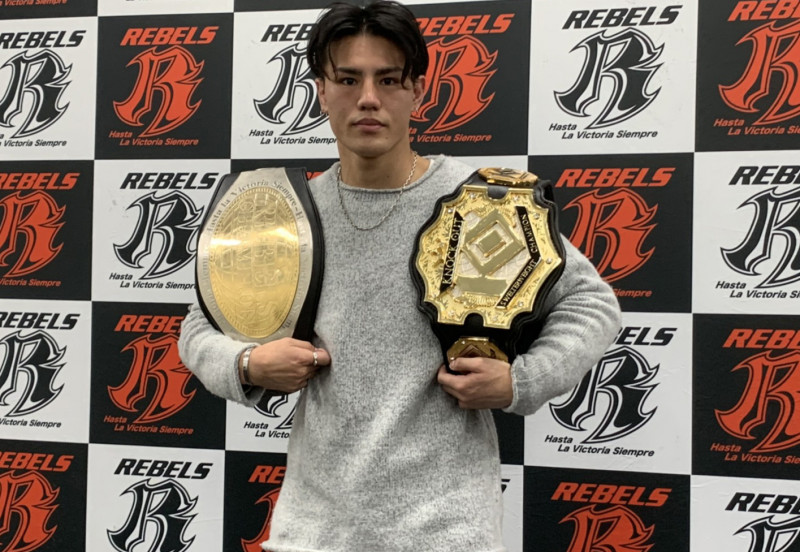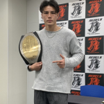 会見終了後には、この日届いたばかりのKNOCK OUT-BLACKスーパーウェルター級のベルトも海人に届けられた。(REBELS王者は自動的にKNOCK OUT王者となるため)