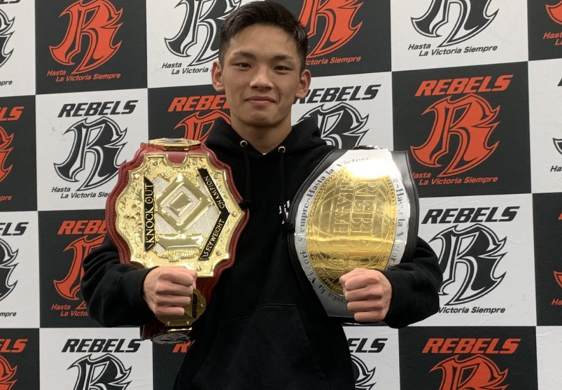 会見終了後には、この日届いたばかりのKNOCK OUT-REDスーパーフライ級のベルトも白幡に届けられた。(REBELS王者は自動的にKNOCK OUT王者となるため)