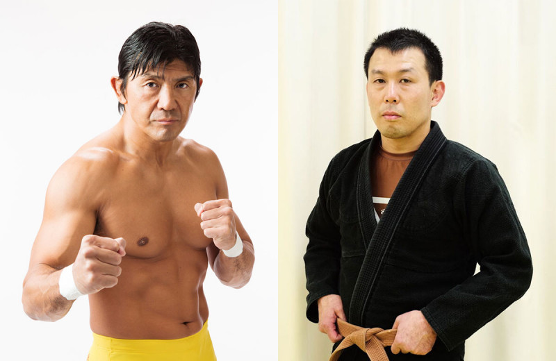 船木誠勝(左)が、“アマチュア格闘技58冠王”長谷川秀樹(右)とエキシビションマッチを行う