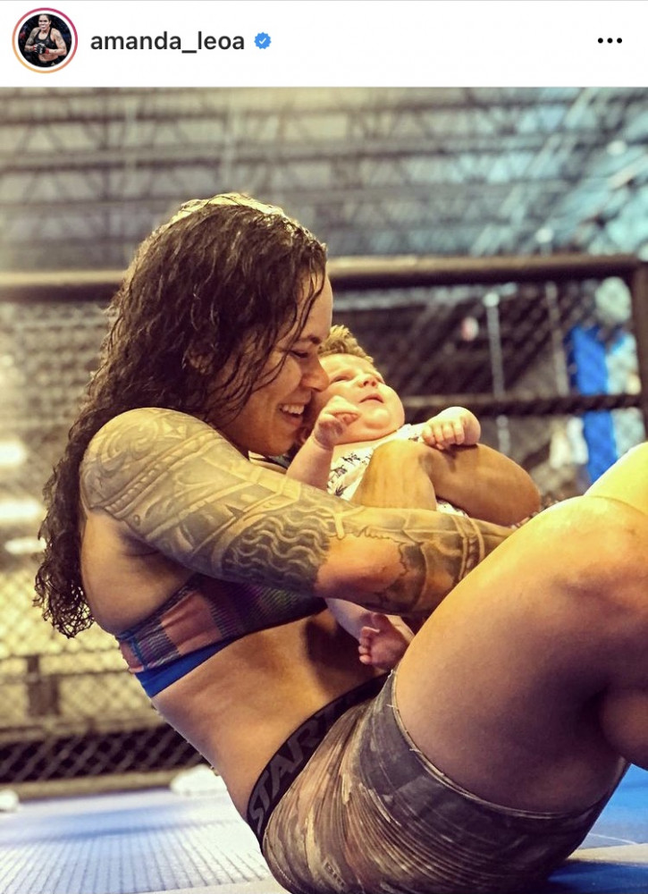 ジムで愛娘を抱え腹筋トレーニングをしているかのようなヌネス@amanda_leoa
