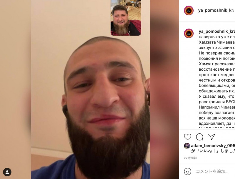 チェチェン共和国のカディロフ首長(右上)が、チマエフと会話した様子を投稿(カディロフ首長の公式SNSより)