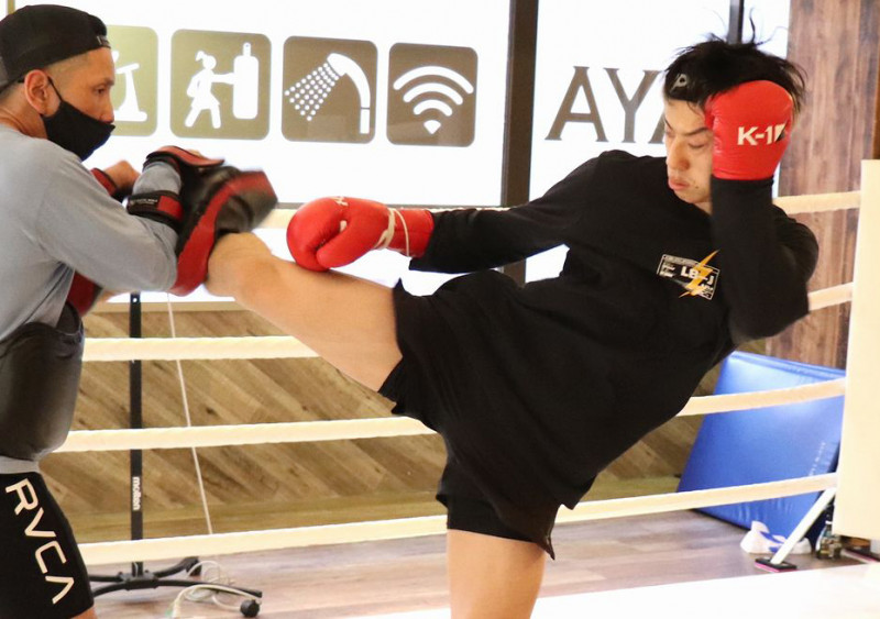 強烈なハイキックをミットに食い込ませる金子、再起戦まで2週間あまり