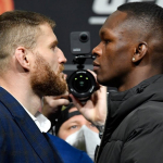 フェイスオフするライトヘビー級王者ブラホビッチ(左)と挑戦者でミドル級王者アデサンヤ(右)(UFC公式YouTubeチャンネル映像サムネイルより)