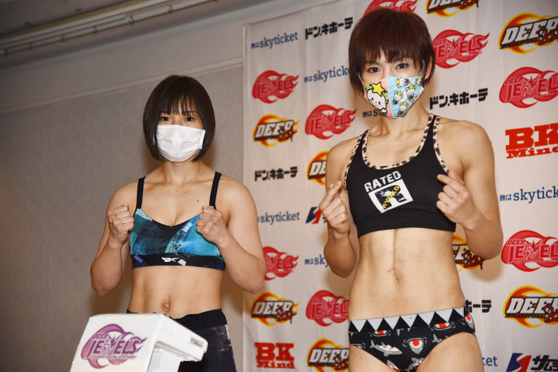 前日計量でスポーツビキニで挑んだと富松恵美(右)と大島沙緒里(左)