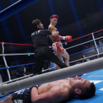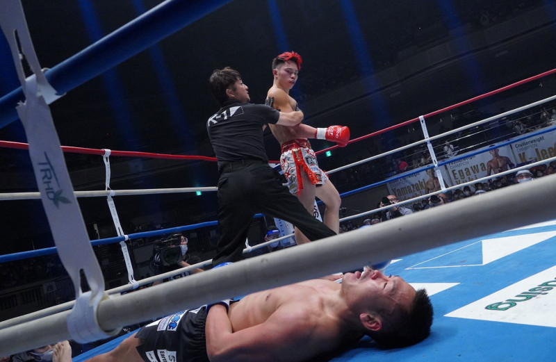 前戦(12月)不可思の右ストレートが決まり、鈴木勇人が仰向けにバッタリ倒れる