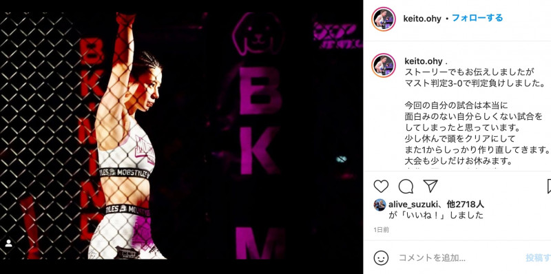入場の写真と共に敗戦への反省をのべたケイト(自身のSNSより)