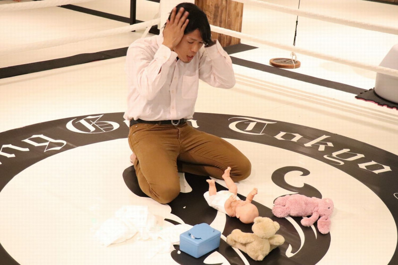 公開練習でおむつ替えを行い頭を抱える城戸 (C)K-1