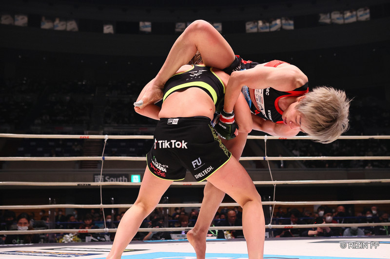 ”パワーな対策”浜崎得意のアームロックに朝倉は立ち上がり浜崎を持ち上げる