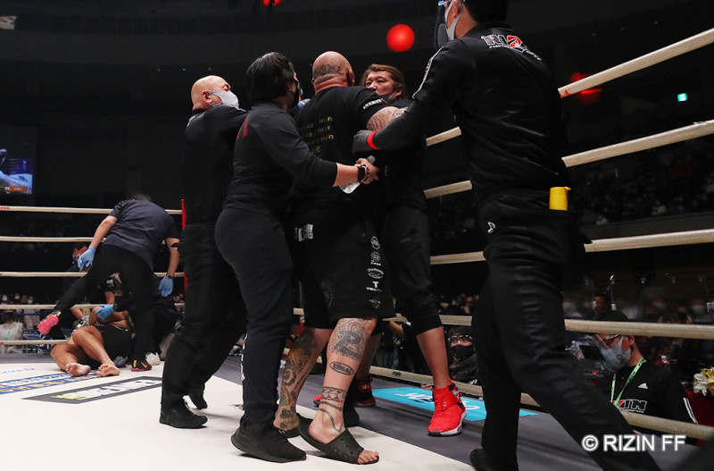 両陣営の乱闘、エンセン井上(左・スダリオ陣営)が宮本陣営の内田ノボル(右)に掴みかかる。