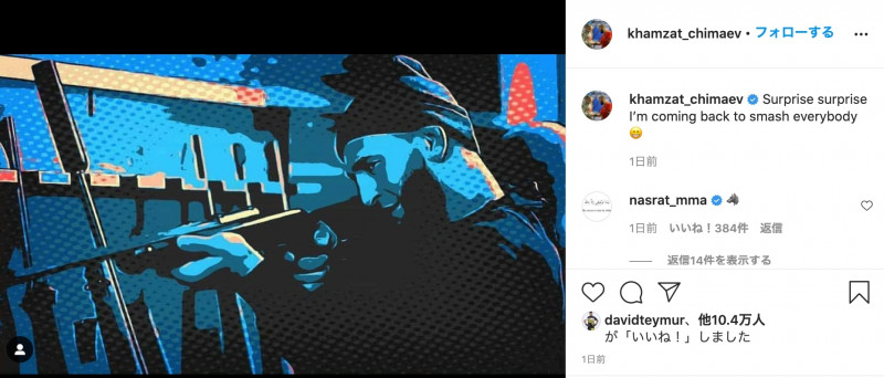 チマエフが復帰を示唆する投稿。スナイパーのように銃を持つ姿が(チマエフの公式SNSより)