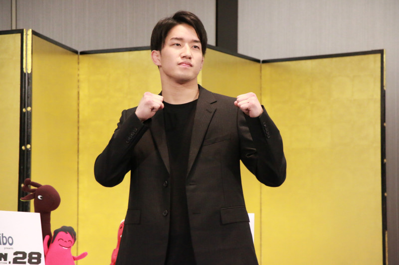 会見に登場しファイティングポーズを見せる朝倉海