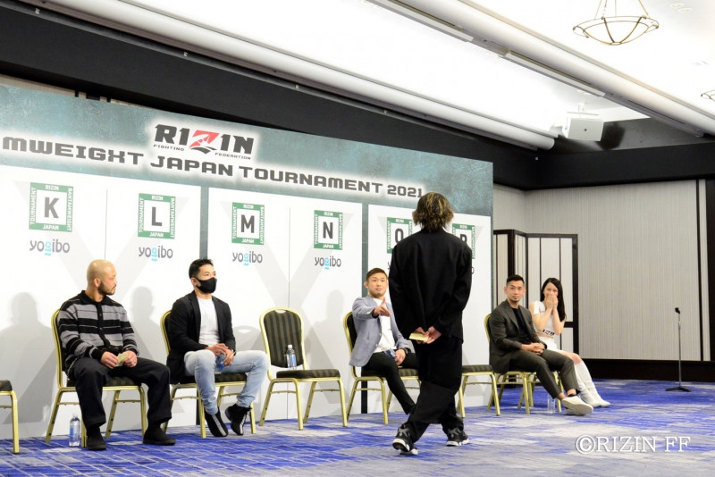 井上が近づき、”俺の隣へ”とばかりにアピールする扇久保(左から3番目)(C)RIZIN FF