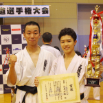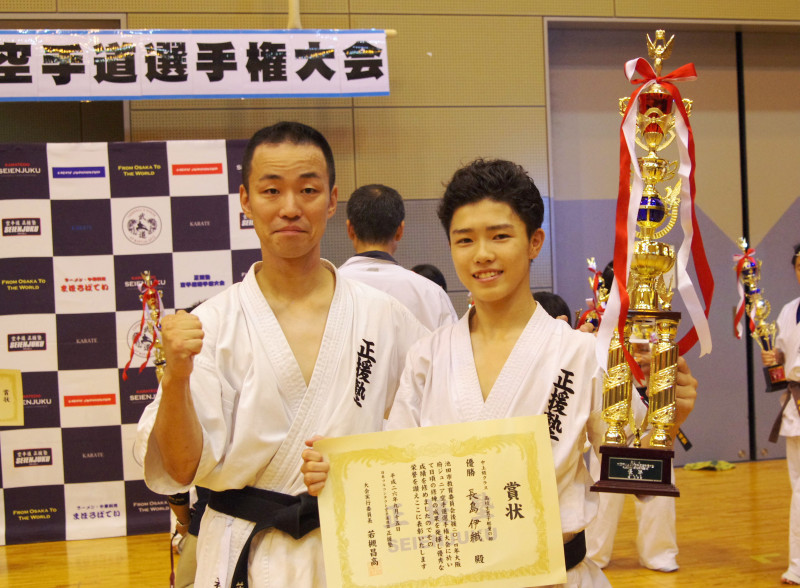 高校時代、空手の大会で優勝した長島さん(右)と正援塾の若槻代表