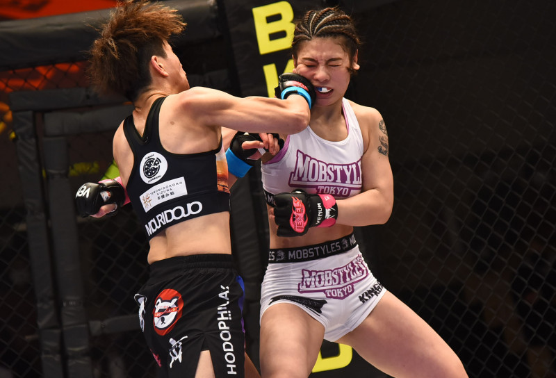 HIMEのパンチがヒット、ケイト(右)の顔が歪む