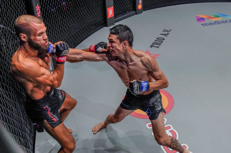 昨年10月、強烈なパンチで相手を追い込むマクラーレン。ヒザ蹴りで1R KO勝ちした(c)ONE Championship