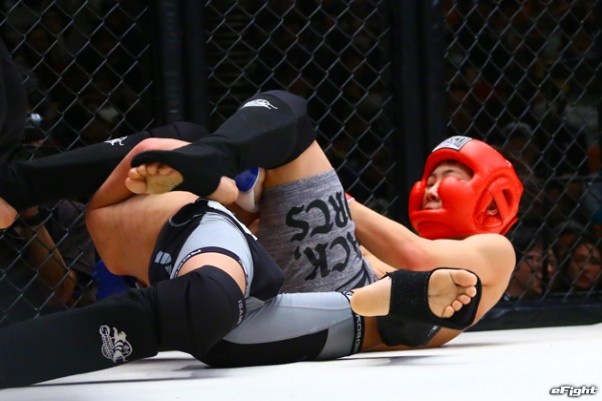 修斗のジュニアファイトで腕十字を仕掛ける鶴屋(右)=17年1月