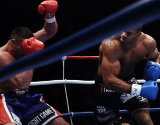 10年のK-1WGPで優勝したアリスター(右)決勝でピーター・アーツ(左)から1RKO勝利を収めた