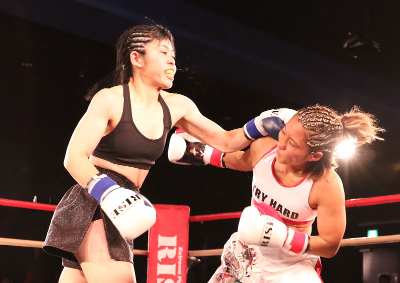 デビュー戦で宮﨑若菜(右)と打ち合う武内