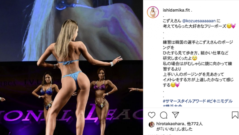 石田が美ボディコンテストのビキニで優勝、バックの背中の筋肉、そしてヒップから足のラインが美しい@ishidamika.fitより
