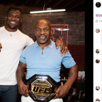 ガヌーのUFCベルトを巻くマイク・タイソン。左はUFC新王者ガヌー(タイソンのFacebookより)