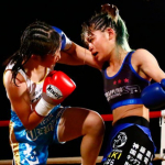 17年9月、当時は無敗女子高生だった寺山(左)を5R攻め続けて勝利、J-GIRLSミニフライ級王座に就いたMISAKI(右)