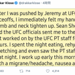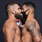 超接近のフェイスオフ、このあとクロース(右)が両手で2メートルほど突き飛ばされ乱闘寸前に(©Getty Images/UFC)