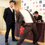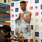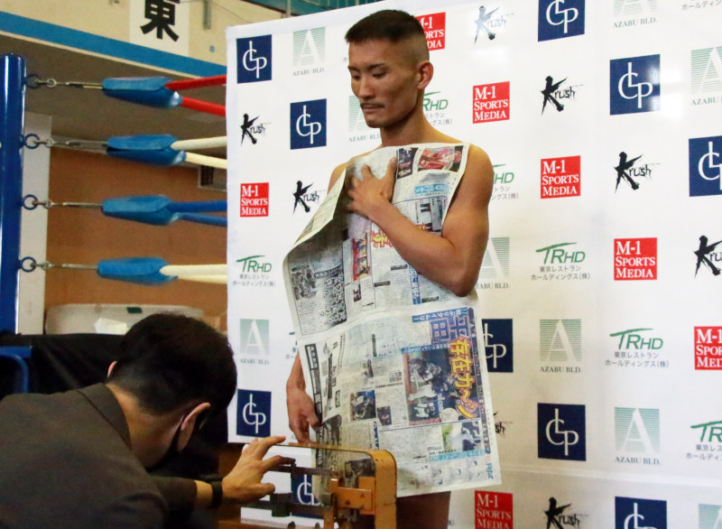 全裸に新聞紙を巻き付けて計量台に上がる堀井