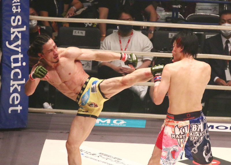 矢地がジークンドーで学んだハイキックを大原樹理にヒットさせる