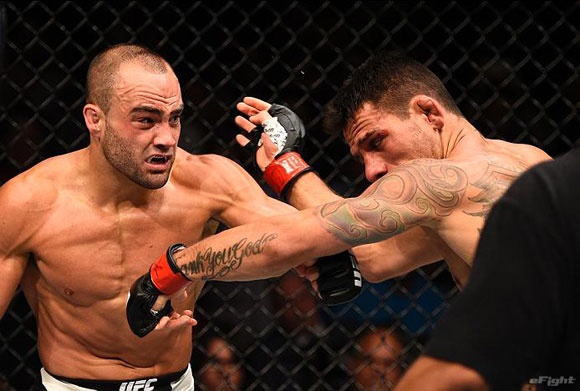 怒濤のパンチラッシュで1RTKO勝利しUFC王座奪取するアルバレス(左)=16年