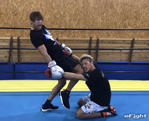 飯伏と練習する前口(右)飯伏の代名詞ともいえる必殺技”カミゴェ”が、前口の顔面に突き刺さる(2018年10月)