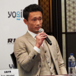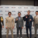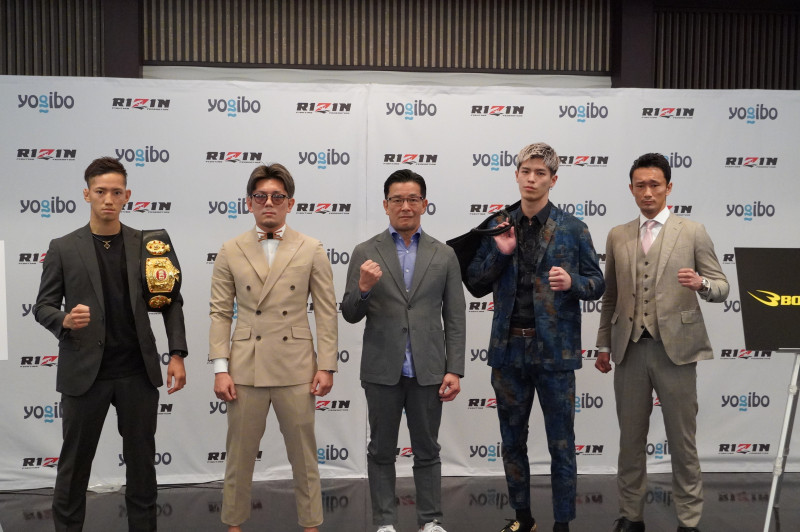 参戦が決定した(左から)高橋亮、皇治(右から)梅野、白鳥(中央)榊原CEO