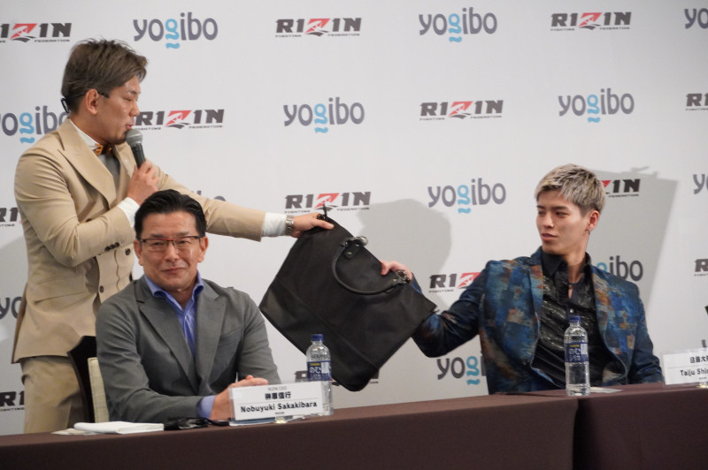 皇治(左)が白鳥にカバンをプレゼント