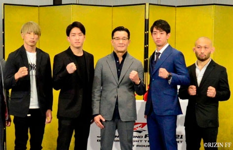 東京ドーム大会で行われる「バンタム級トーナメント」発表会見に出席した(左から)渡部修斗、朝倉海、RIZIN榊原代表、瀧澤謙太、今成正和