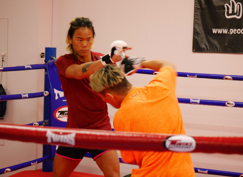 兄・裕人(右)を相手に軽めのスパーを披露した山口侑馬