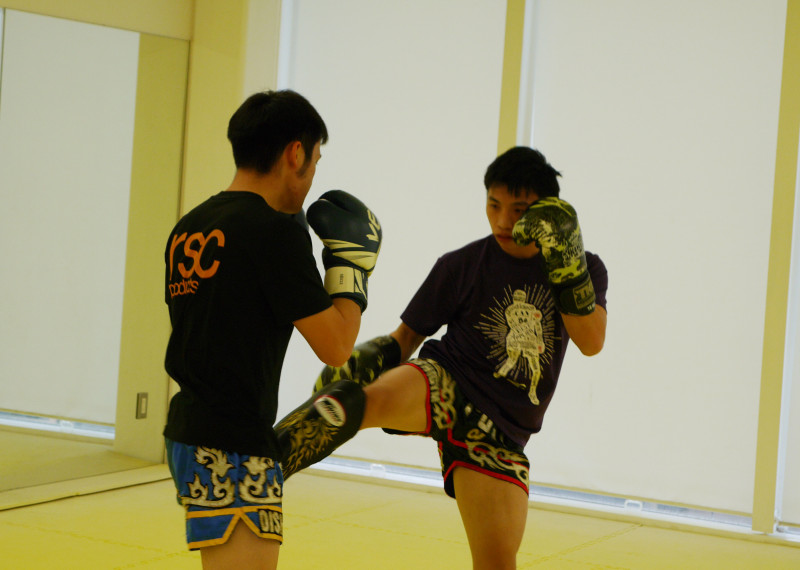 弟・孔稀(左)を相手にスパーリングを披露した大﨑一貴(C)RISE