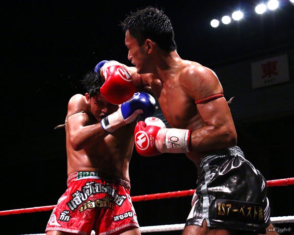 相手の頭部にヒジを打ち込む梅野